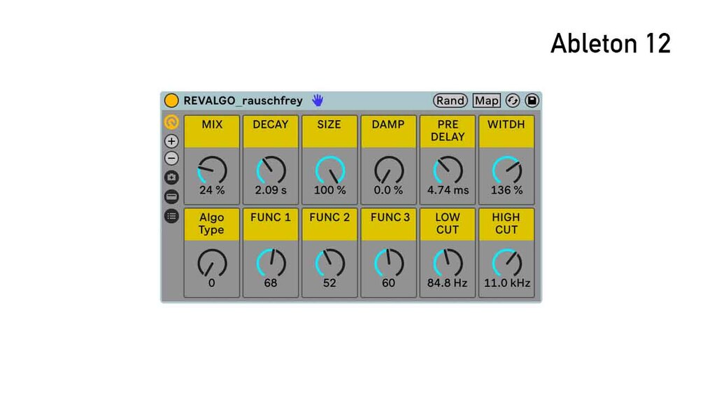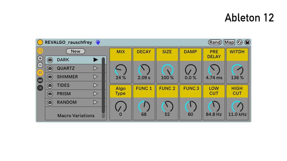 Shape your space with REVALGO – a modern reverb rack built for depth, movement, and control, based on Ableton’s great Hybrid Reverb unit.